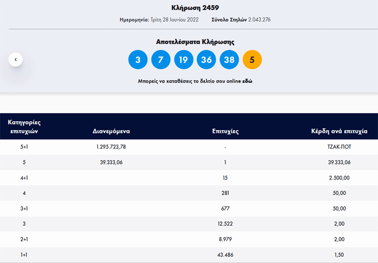 Οι τυχεροί αριθμοί: 3, 7, 19, 36, 38. ΤΖΟΚΕΡ: 5.