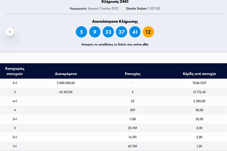 Οι τυχεροί αριθμοί: 5, 9, 33, 37, 41. ΤΖΟΚΕΡ: 12.