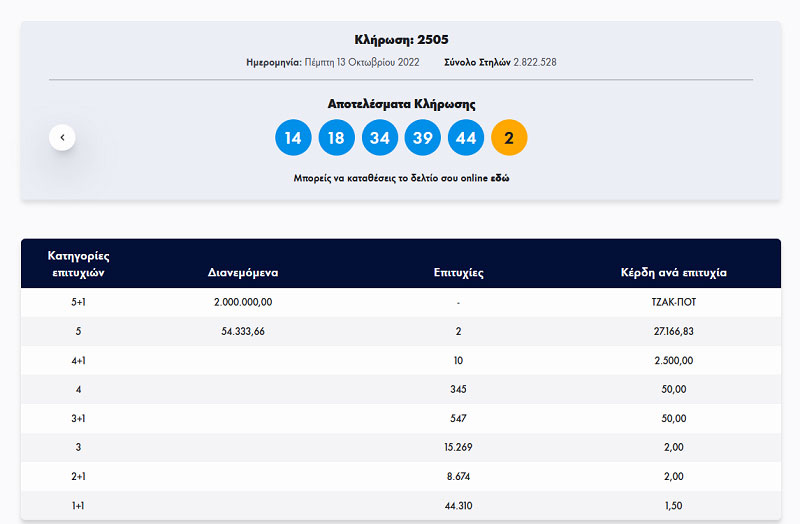 Οι τυχεροί αριθμοί: 14, 18, 34, 39, 44. ΤΖΟΚΕΡ: 2.