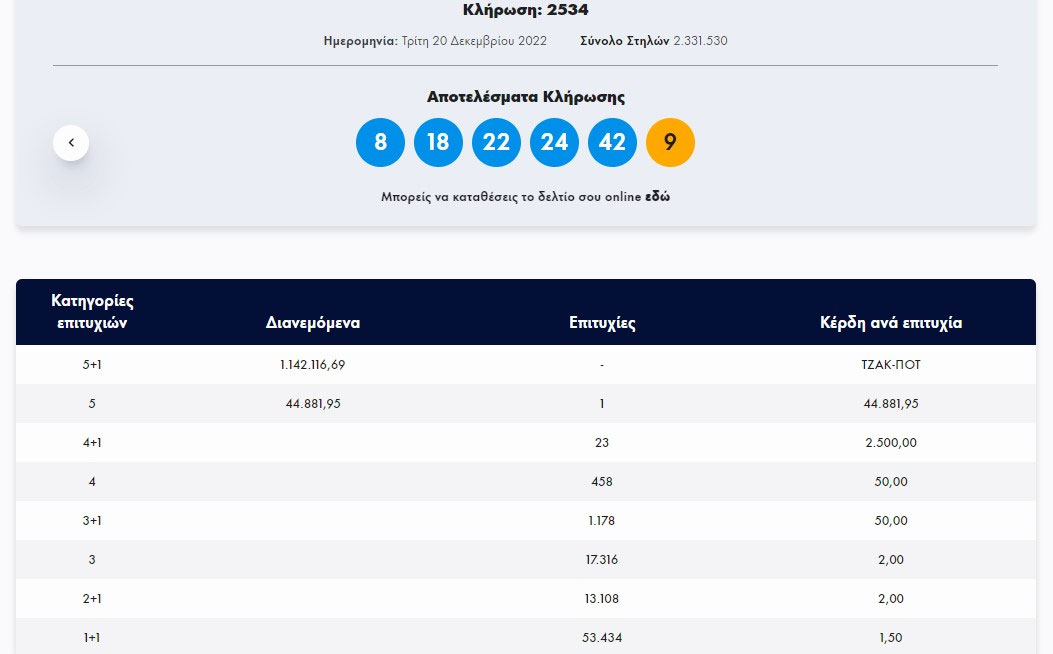 Οι τυχεροί αριθμοί: 8, 18, 22, 24, 42. ΤΖΟΚΕΡ: 9.