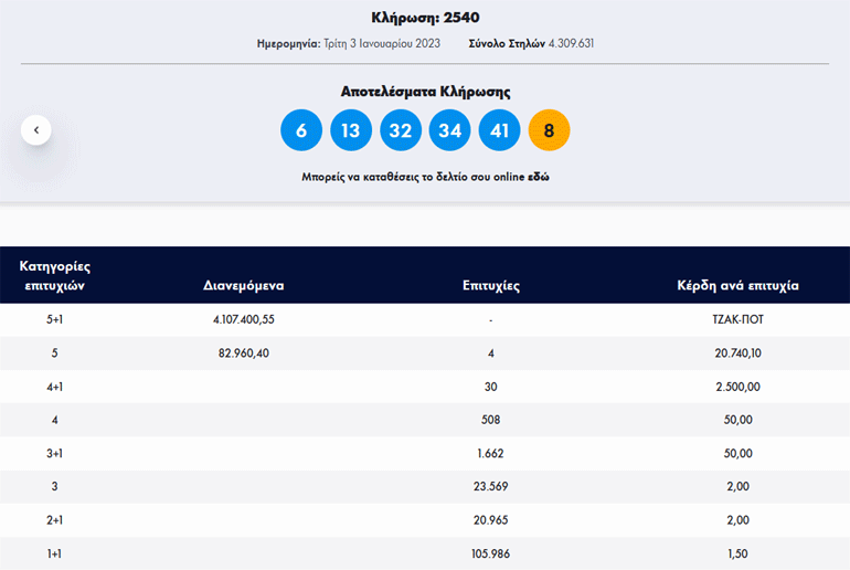 Χωρίς νικητή στην πρώτη κατηγορία ολοκληρώθηκε η κλήρωση και η διαλογή στο Τζόκερ. Αντίθετα, στη δεύτερη κατηγορία βρέθηκαν τέσσερα δελτία που κερδίζουν