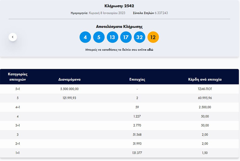 Οι τυχεροί αριθμοί: 4, 5, 13, 17, 32 TZΟΚΕΡ: 12