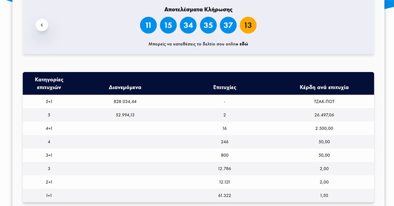 Χωρίς νικητή στην πρώτη κατηγορία ολοκληρώθηκε η κλήρωση και η διαλογή στο Τζόκερ. Αντίθετα, στη δεύτερη κατηγορία βρέθηκαν δύο δελτία...