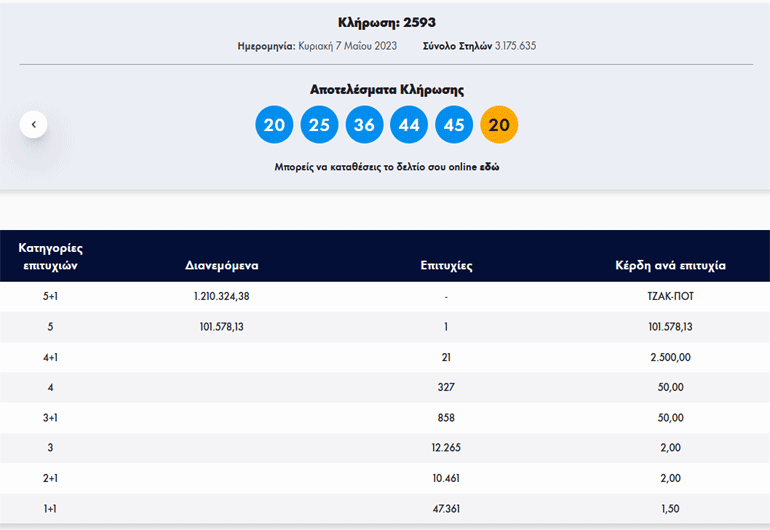 Οι τυχεροί αριθμοί: 20, 25, 36, 44, 45. ΤΖΟΚΕΡ: 20.