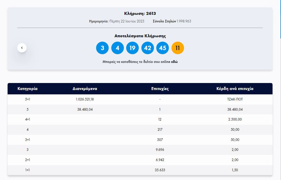 Οι τυχεροί αριθμοί: 3, 4, 19, 42, 45. ΤΖΟΚΕΡ: 11.