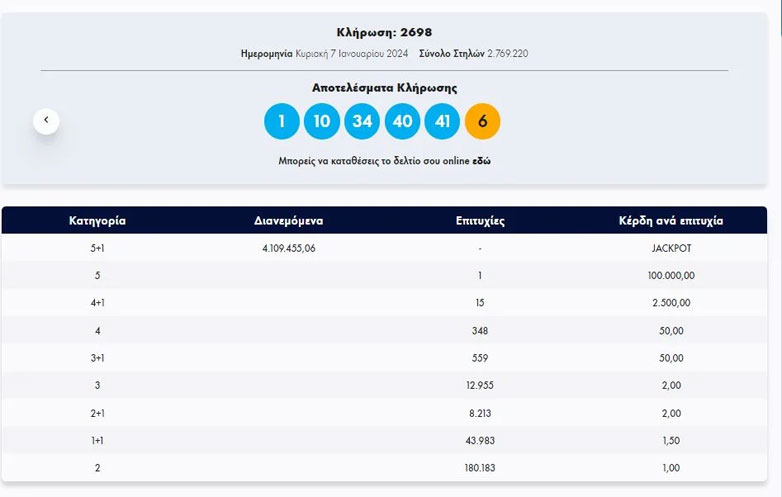 Οι τυχεροί αριθμοί στη σημερινή κλήρωση είναι οι εξής: 1, 10, 34, 40, 41 και τζόκερ ο αριθμός: 6.