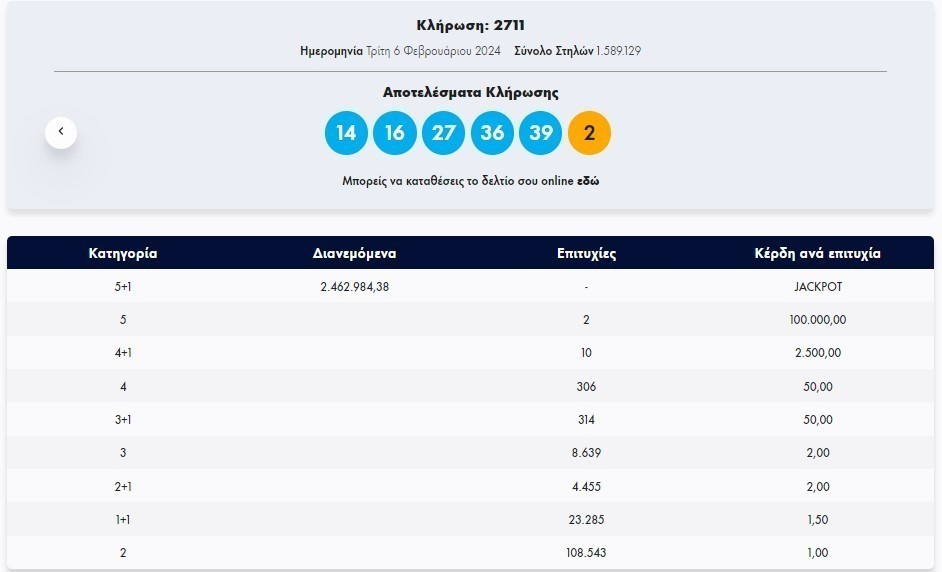 Οι τυχεροί αριθμοί στη σημερινή κλήρωση είναι οι εξής: 14, 16, 27, 36, 39 και τζόκερ ο αριθμός: 2.