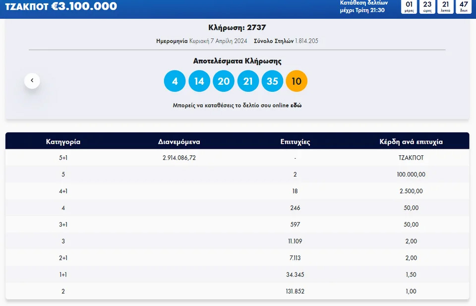 Οι τυχεροί αριθμοί στη σημερινή κλήρωση είναι οι εξής: 4, 14, 20, 21, 35 και τζόκερ ο αριθμός: 10.