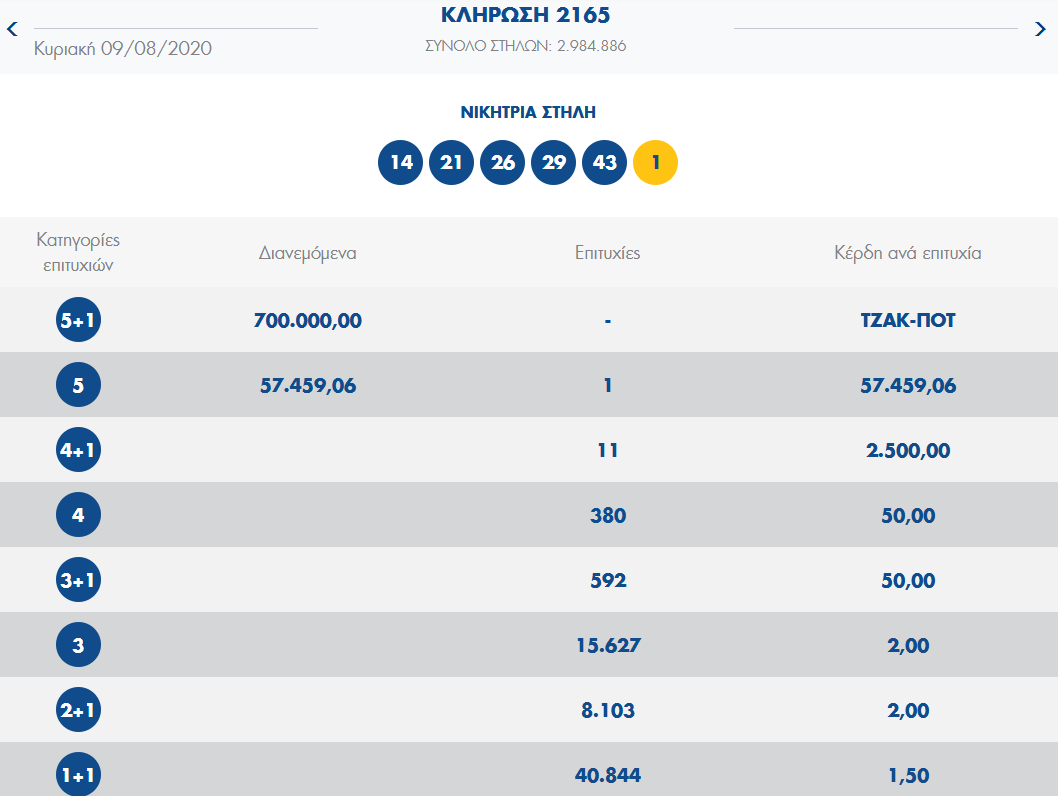 Οι αριθμοί που ανέδειξε η κληρωτίδα στην αποψινή κλήρωση είναι οι: 14, 21, 26, 29, 43