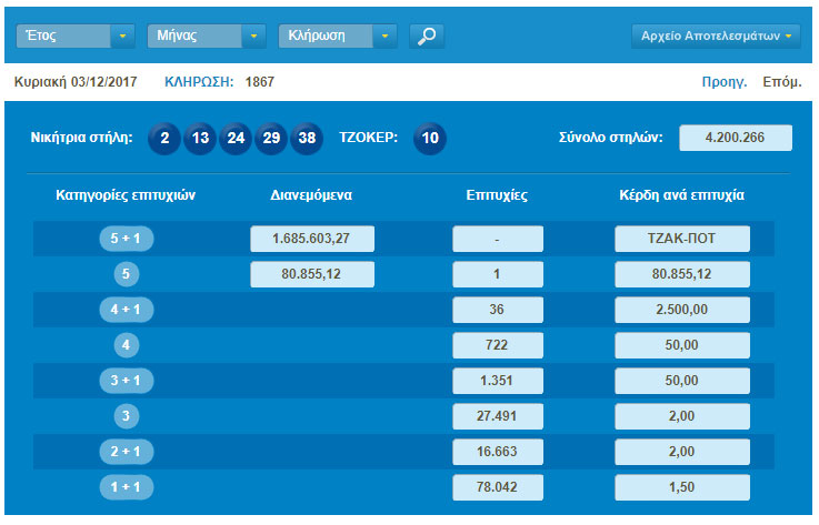 Δεν βρέθηκε νικητής στην πρώτη κατηγορία και έτσι στην επόμενη κλήρωση της Κυριακής θα μοιραστούν πάνω από 2,2 εκ. ευρώ.