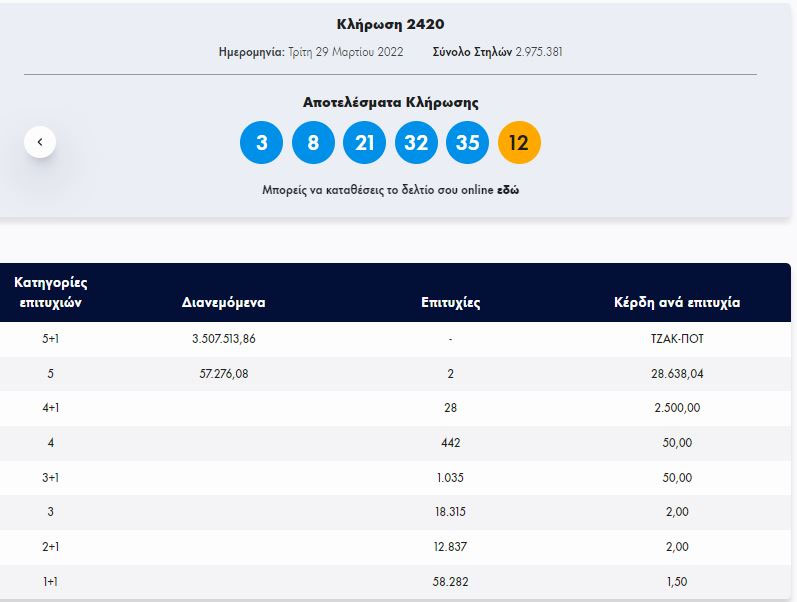Χωρίς νικητή στην πρώτη κατηγορία ολοκληρώθηκε η κλήρωση του Τζόκερ, η οποία μοίραζε 3,5 εκατ. ευρώ. Αντίθετα, στη δεύτερη κατηγορία βρέθηκαν...