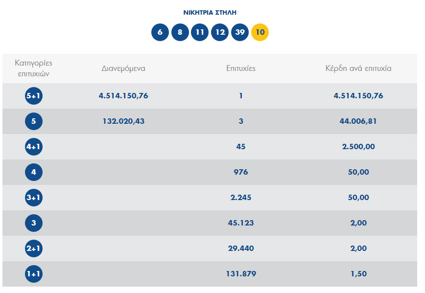 Οι τυχεροί αριθμοί: 6, 8, 11, 12, 39,