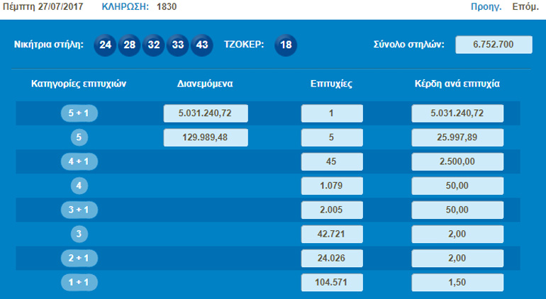 Πέρα από τον υπερνικητή που κέρδισε το ποσό των 5.031.240,72 ευρώ, βρέθηκαν στην δεύτερη κατηγορία 5 επιτυχημένα δελτία που κερδίζουν από 25.997,89 ευρώ το κάθε ένα.