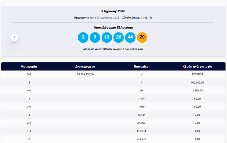 Οι αριθμοί που κληρώθηκαν είναι οι: 2, 9, 13, 26, 44 και τζόκερ το 20.