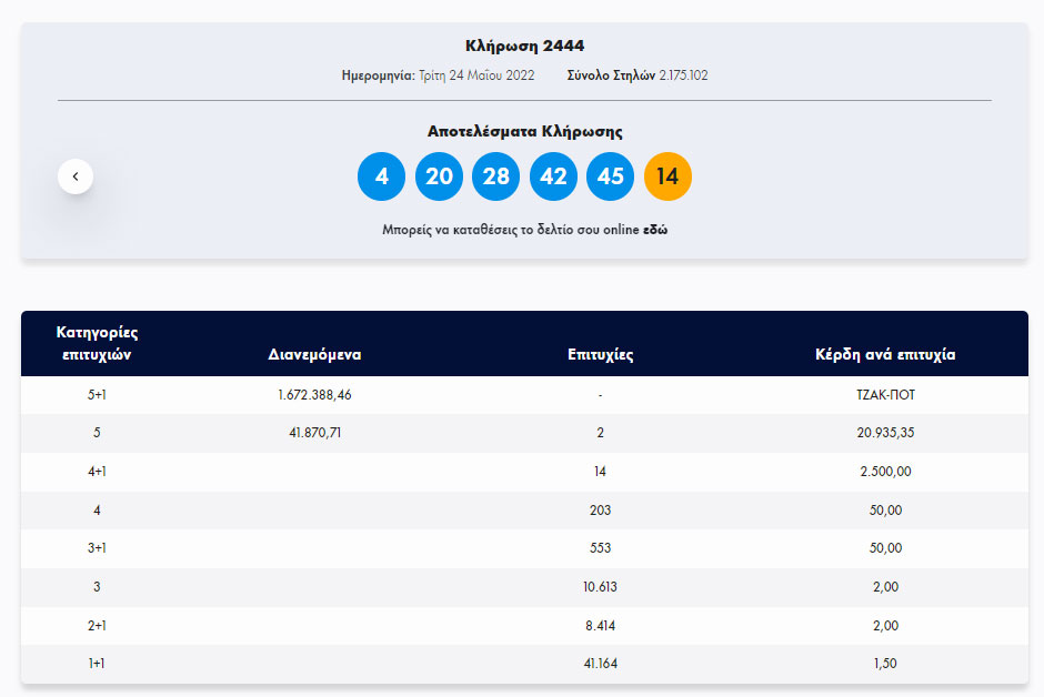 Οι τυχεροί αριθμοί: 4, 20, 28, 42, 45. ΤΖΟΚΕΡ: 14.