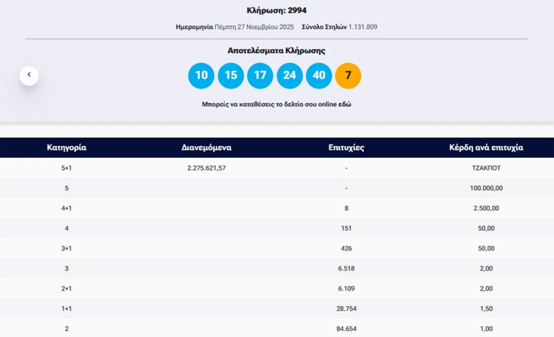 Οι τυχεροί αριθμοί που ανέδειξε η αποψινή κληρωτίδα είναι οι: 10, 15, 17, 24, 40 και αριθμός Τζόκερ το 7.