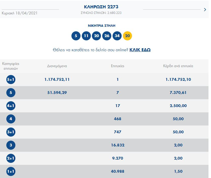 Έναν υπερτυχερό που θα δει τον λογαριασμό του να... φουσκώνει κατά 1. 714.000 ευρώ ανέδειξε την...