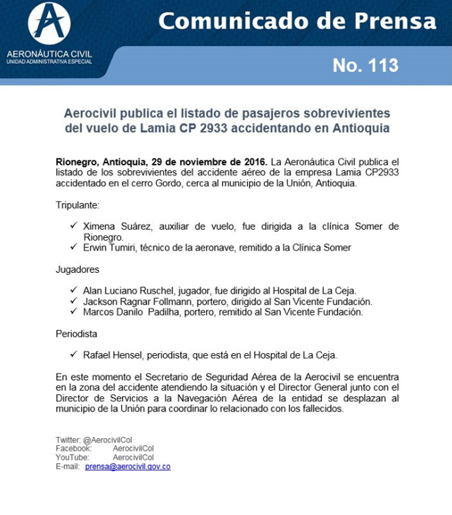 To Sputnik μετέδωσε ότι ο αμυντικός Alan Ruschel (27 ετών) είναι ένας από τους επιζώντες. Ζωντανοί είναι, επίσης, ο τερματοφύλακας Jakson Follmann (24 ετών) και ο σέντερ μπακ Helio Hermito Zampier Neto (31 ετών). Ο τελευταίος μεταφέρθηκε στο νοσοκομείο με σοβαρά τραύματα στο κεφάλι και νοσηλεύεται σε κρίσιμη κατάσταση.