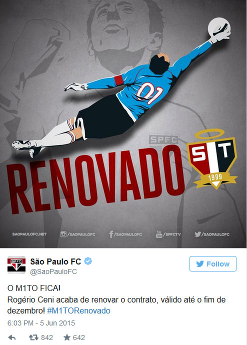 «Ο Μύθος μένει. Ο Ροζέριο Σένι μόλις ανανέωσε το συμβόλαιό του, το οποίο θα έχει ισχύ έως το Δεκέμβρη», ανέφερε χαρακτηριστικά το σχετικό tweet του βραζιλιάνικου συλλόγου.