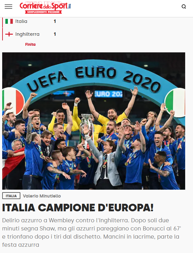 Corriere dello Sport: «Πρωταθλήτρια Ευρώπης η Ιταλία: γαλάζιο ντελίριο στο Γουέμπλεϊ κόντρα στην Αγγλία»