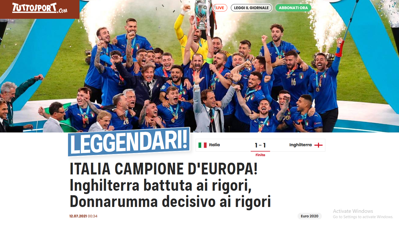 Ντελίριο ενθουσιασμού προκάλεσε η κατάκτηση του Euro 2020 στην Ιταλία, με τα ΜΜΕ της γειτονικής χώρας να αποθεώνουν την «αρμάδα» του Μαντσίνι, η οποία κατάφερε μέσα στο Γουέμπλεϊ να σηκώσει το βαρύτιμο τρόπαιο για δεύτερη φορά στην ιστορία της.