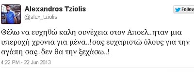 Τους ανθρώπους και τους φιλάθλους του ΑΠΟΕΛ αποχαιρέτησε ο Αλέξανδρος Τζιόλης. Ο Έλληνας μέσος, ο οποίος αγωνίστηκε την σεζόν που ολοκληρώθηκε στoν «θρύλο» με την μορφή δανεισμού από τη Μονακό, μέσω του λογαριασμού του στο twitter αποφάσισε να ευχαριστήσει την κυπριακή ομάδα και να της ευχηθεί καλή συνέχεια.