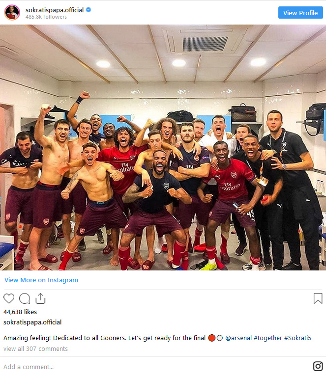 Λίγο μετά το τέλος του ημιτελικού στη Βαλένθια, όπου οι Λονδρέζοι επικράτησαν με 4-2 και προκρίθηκαν πανηγυρικά στον τελικό, ο «Sokratis» ανήρτησε στο Instagram μία φωτογραφία από τα αποδυτήρια της ομάδας του με το εξής σχόλιο: