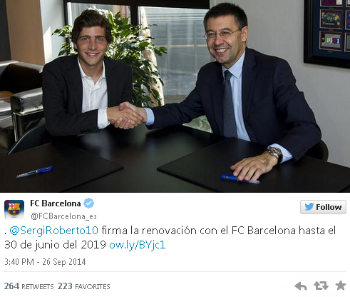 Ο Καταλανός μέσος, που εντάχθηκε στη «Μασία» το 2006 σε ηλικία 14 ετών και το 2010 έκανε το ντεμπούτο του με την πρώτη ομάδα των «μπλαουγκράνα», βρέθηκε σήμερα στα γραφεία του συλλόγου και επικύρωσε την προφορική συμφωνία που υπήρχε ανάμεσα στις δύο πλευρές.