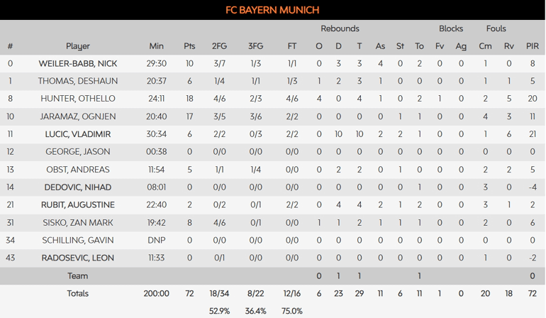 Ο Νίκολα Μίροτιτς τελείωσε τον αγώνα με 20 πόντους, ενώ ο Νικ Καλάθης μέτρησε 10 πόντους και 5 ασίστ. Από την Μπάγερν έλαμψε ο Οθέλο Χάντερ με 18 πόντους.