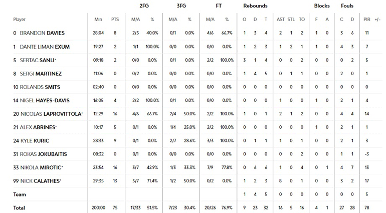 Από την Μπαρτσελόνα, που πλήρωσε αστοχία από τα 6.75 (7/23) και λάθη (16), προσπάθησαν οι Νίκολα Μίροτιτς (16π.) και Νίκολας Λαπροβίτολα (16π.), ενώ ο Νικ Καλάθης είχε σε 30 λεπτά συμμετοχής 13 πόντους, 3 ριμπάουντ και 8 ασίστ.