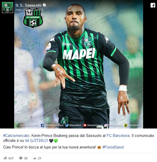 Μάλιστα η ιταλική ομάδα ανακοίνωσε την παραχώρηση του Μπόατενγκ με την εξής ανάρτηση:
