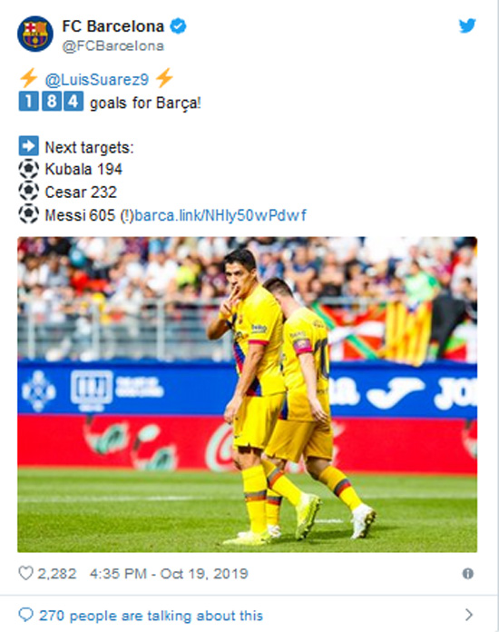 O Λουίς Σουάρες, μετά τα δύο γκολ του απέναντι στην Ίντερ, βρήκε δίχτυα και στον σημερινό νικηφόρο (3-0) αγώνα της Μπαρτσελόνα με την Εϊμπάρ, φτάνοντας τα 184 γκολ με την φανέλα του συλλόγου της Βαρκελώνης.