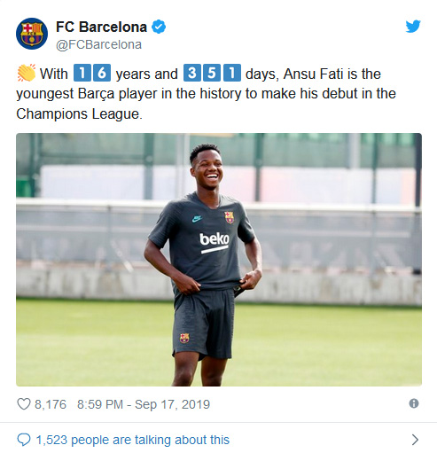 Ο Ερνέστο Βαλβέρδε ξεκίνησε βασικό τον Ανσού Φατί στον αγώνα της Μπαρτσελόνα με την Ντόρτμουντ κι έτσι ο ταλαντούχος άσος σε ηλικία μόλις 16 ετών και 321 ημερών έγινε ο τρίτος νεότερος παίκτης που κάνει ντεμπούτο στον θεσμό του Τσάμπιονς Λιγκ.