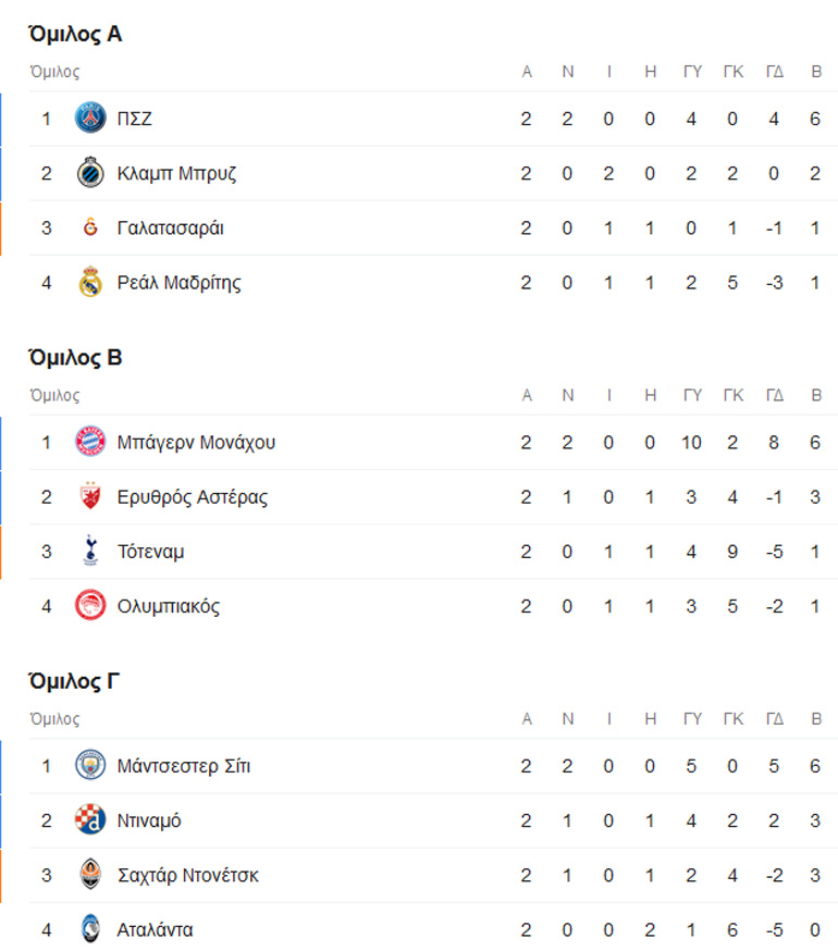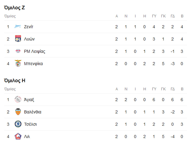 Τέλος, η Λιον νίκησε με 2-0 τη Λειψία στη Γερμανία, ενώ η Μπενφίκα ηττήθηκε με 3-1 από τη Ζενίτ στην Αγία Πετρούπολη.