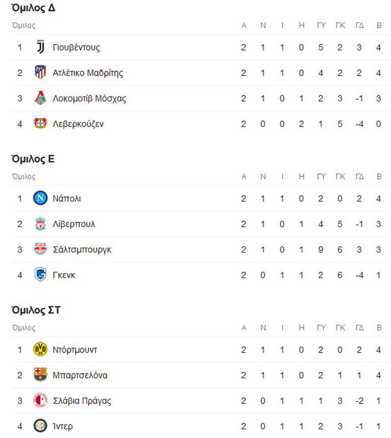 Νωρίτερα, η Νάπολι στραβοπάτησε (0-0) στην έδρα της Γκενκ, ενώ αντίθετα η Ντόρτμουντ έφυγε με το τρίποντο από την Πράγα, επικρατώντας 2-0 της Σλάβια.