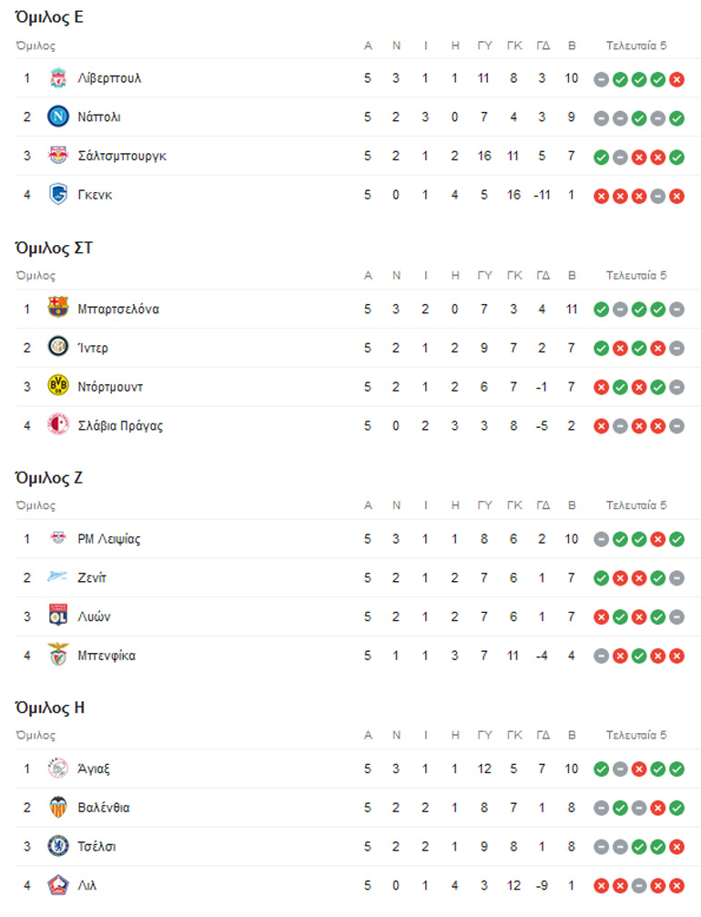 Από εκεί και πέρα η Ίντερ και η Ντόρτμουντ έχουν από 7 βαθμούς και θα μονομαχήσουν για τη δεύτερη θέση, με τους «νερατζούρι» να χρειάζονται ίδιο ή καλύτερο αποτέλεσμα από τους Βεστφαλούς για να προκριθούν εκείνοι.