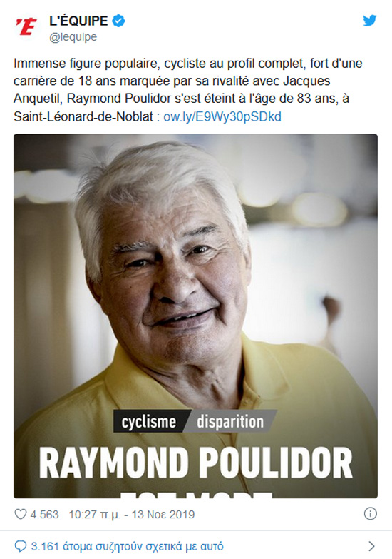 Τον χαμό του Ρεϊμόν Πουλιντόρ θρηνεί ο κόσμος της ποδηλασίας.
