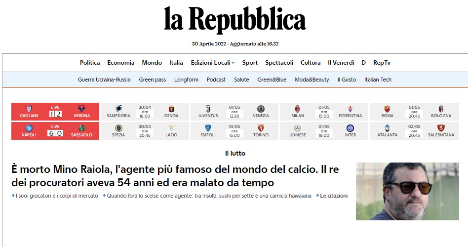 Πέθανε ο Μίνο Ραϊόλα, ο πιο γνωστός μάνατζερ ποδοσφαίρου παγκοσμίως, αναφέρει στο πρωτοσέλιδό της η «La Repubblica»: