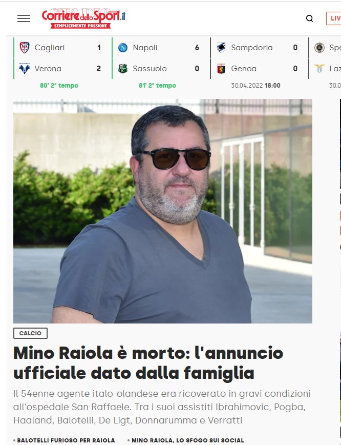 Η «Correre dello Sport» έχει τίτλο: Ο Μίνο Ραϊόλα πέθανε, η επίσημη ανακοίνωση της οικογένειας: