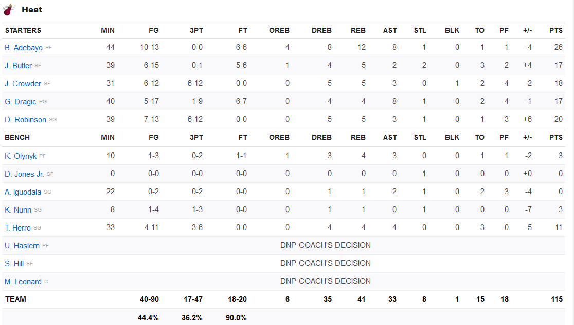 Επίσης για τους Χιτ, ο Ρόμπινσον είχε 20 πόντους (6/12 τρίποντα), 5 ριμπάουντ και 3 ασίστ και ο Κράουντερ 18 πόντους, 5 ριμπάουντ και 3 ασίστ.