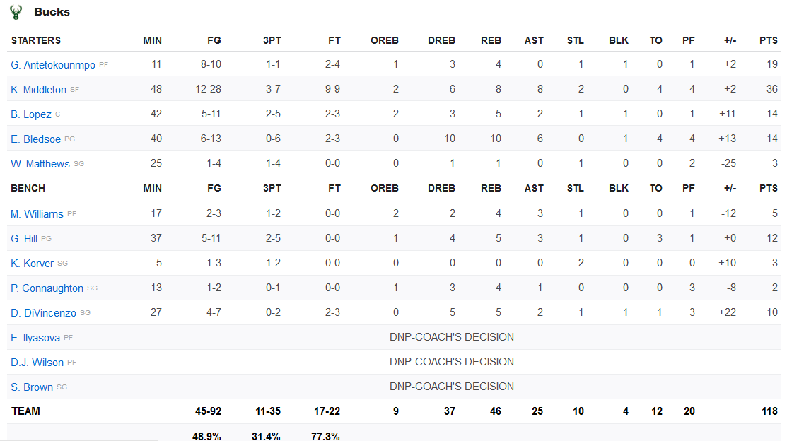 Αδιαμφισβήτητα ο Μίντλετον, με 36 πόντους, 8 ριμπάουντ, 8 ασίστ και 2 κλεψίματα ήταν ο ΜVP των Μπακς, ενώ ο Μπλέντσο είχε 14 πόντους, 10 ριμπάουντ και 6 ασίστ. Ο Αντεμπάγιο (26π., 12ρ. και 8 ασίστ) ξεχώρισε από το -ηττημένο αυτή τη φορά- Μαϊάμι.