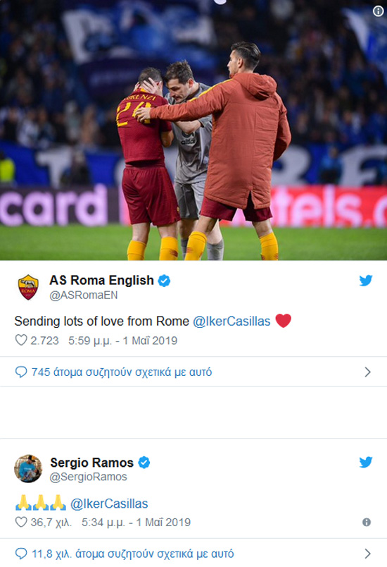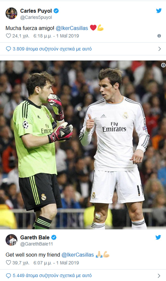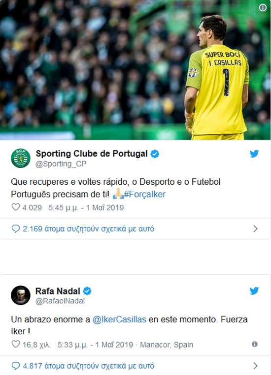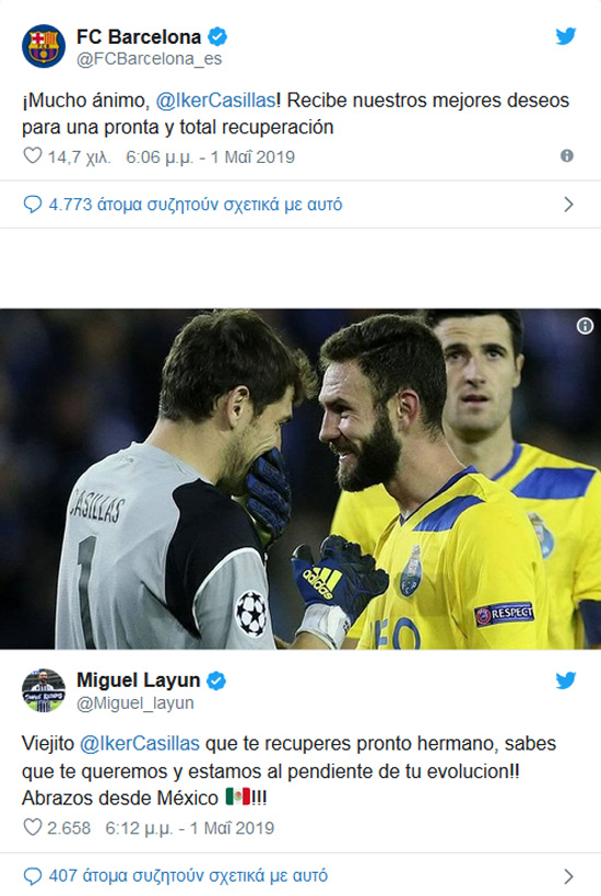 Όπως είναι φυσικό από τη στιγμή που έγινε γνωστή η είδηση άνθρωποι του αθλητισμού από όλο τον κόσμο έσπευσαν να εκφράσουν τις ευχές τους για ταχεία ανάρρωση στον Ίκερ Κασίγιας.