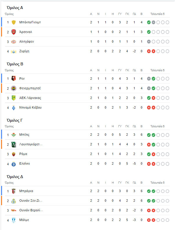 Τρεις ομάδες (Μπέτις, Σεντ Ζιλουάζ και Μπράγκα) έκαναν το «2 στα 2» στο ξεκίνημα των ομίλων του Europa League κι από νωρίς απόκτησαν προβάδισμα για την πρόκριση τους στην επόμενη φάση. Η Ρόμα «άνοιξε λογαριασμό», όπως και η Μπόντο Γκλιμτ με το άνετο 2-0 επί της Ζυρίχης, ενώ «σεφτέ» στις νίκες έκανε και η ΑΕΚ Λάρνακας με το μεγάλο «διπλό» (1-0) επί της Ντιναμό Κιέβου, σε αγώνα που διεξήχθη επί πολωνικού εδάφους (Κρακοβία).