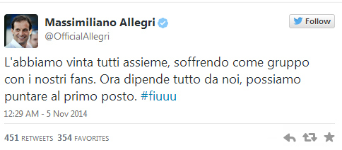 «Νικήσαμε όλοι μαζί, υποφέροντας ως ομάδα μαζί με τον κόσμο μας. Όλα εξαρτώνται από εμάς τώρα, μπορούμε ακόμη και την πρώτη θέση», έγραψε χαρακτηριστικά ο τεχνικός των πρωταθλητών Ιταλίας.