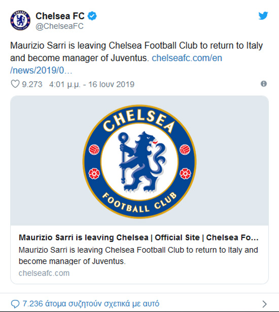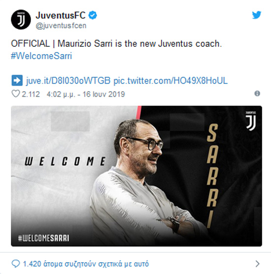 Προπονητής της Γιουβέντους είναι και επίσημα ο Μαουρίτσιο Σάρι, καθώς την Κυριακή η «βέκια σινιόρα» ανακοίνωσε την πρόσληψη του Ιταλού τεχνικού, ο οποίος επαναπατρίστηκε μετά από ένα χρόνο στον πάγκο της Τσέλσι.