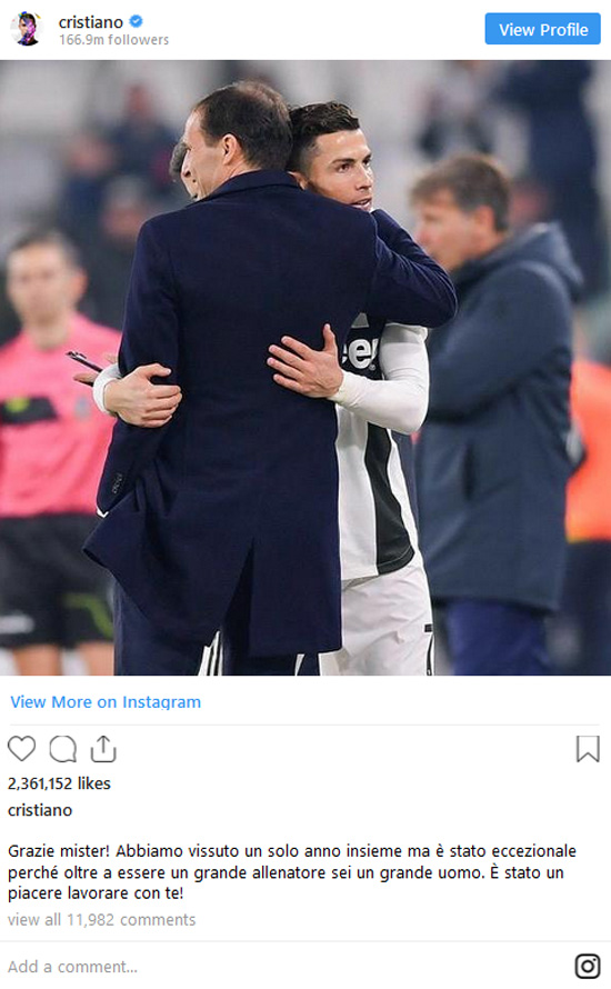 Τον Μασιμιλιάνο Αλέγκρι, ο οποίος θα αποτελέσει παρελθόν για τη Γιουβέντους, αποχαιρέτησε με μήνυμά του στα social media ο μεγάλος αστέρας της πρωταθλήτριας Ιταλίας, Κριστιάνο Ρονάλντο.