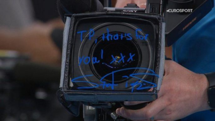Πιο συγκεκριμένα, πριν πάει στα αποδυτήρια ο Έλληνας πρωταθλητής, κατά την καθιερωμένη αφιέρωση του νικητή, έγραψε στην καμερα: «Τ.Ρ. that’s for you» (σ.σ. Θ.Π. αυτό είναι για εσένα), προσθέτοντας τρία φιλιά.