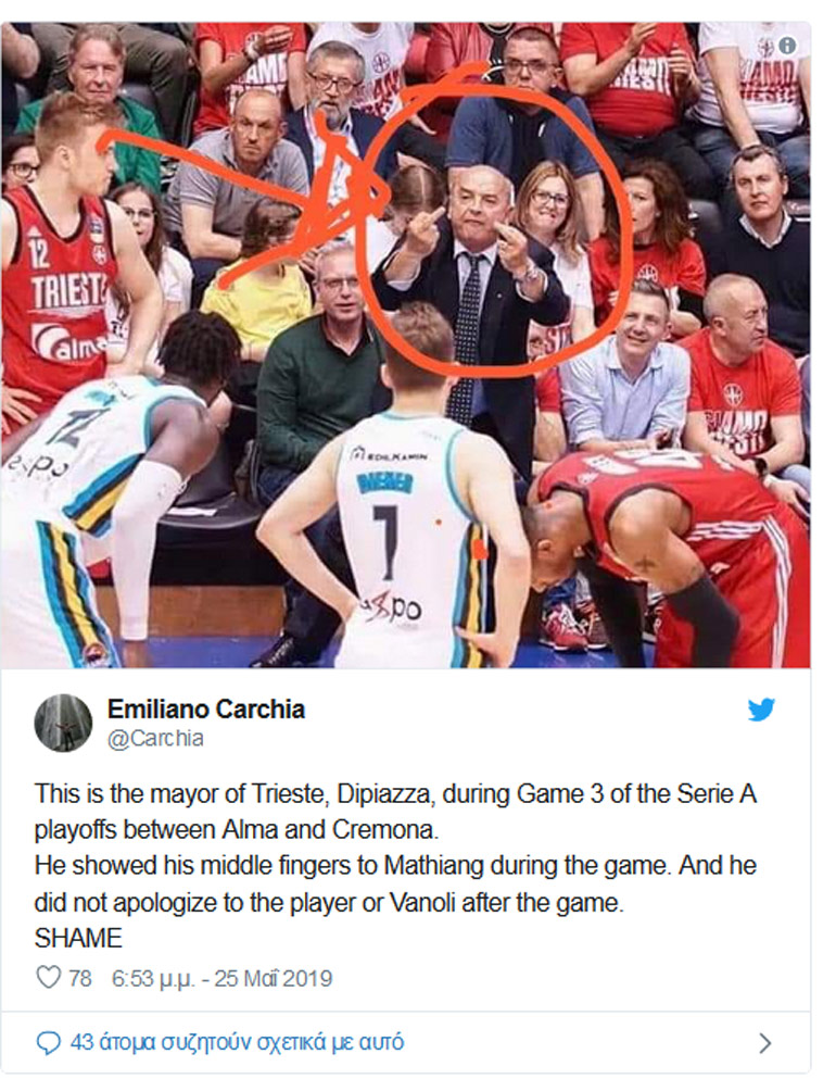 Ένα απίστευτο γεγονός συνέβη κατά τη διάρκεια του αγώνα μπάσκετ της Τριέστε με την Κρεμόνα για τα πλέι οφ της ιταλικής λίγκας. Λίγο πριν τελειώσει το πρώτο ημίχρονο ο φωτογραφικός φακός συνέλαβε τον δήμαρχο της Τεργέστης, να κάνει άσεμνες χειρονομίες. Ο Ρομπέρτο Ντιπιάτσα ο οποίος προέρχεται από τον συνδυασμό του Σίλβιο Μπερλουσκόνι, Φόρτσα Ιτάλια, σήκωσε τα μεσαία δάκτυλα των χεριών του προς τον Αυστραλό παίχτη της Κρεμόνα, Μανκόγκ Ματιάνγκ.