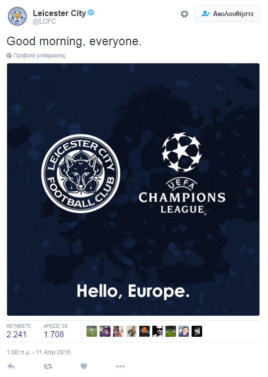 Ο επίσημος λογαριασμός της Λέστερ στο Twitter καλημέρισε τους φίλους της ομάδας το πρωί της Δευτέρας με μια «ευρωπαϊκή καλημέρα».