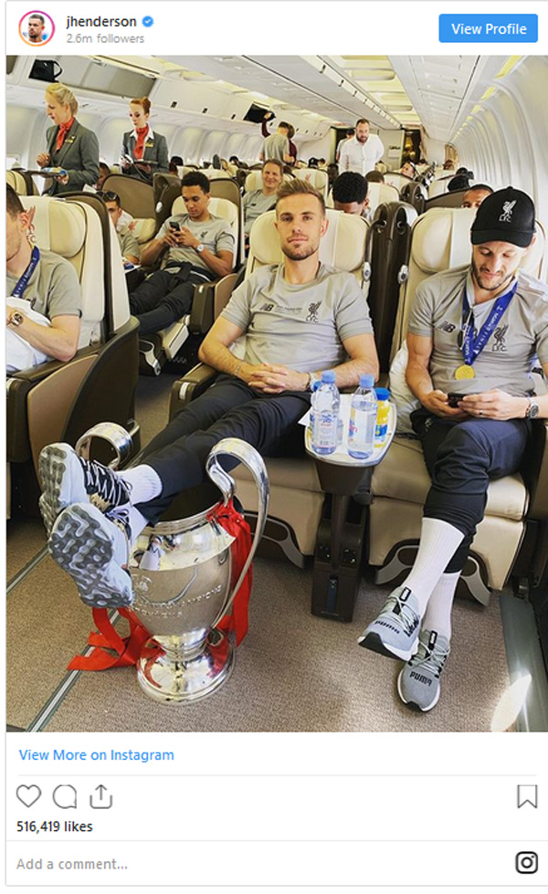 Ο Τζόρνταν Χέντερσον ανέβασε φωτογραφία από το αεροπλάνο της επιστροφής στο Λίβερπουλ έχοντας τα πόδια του πάνω στο τρόπαιο του Champions League.